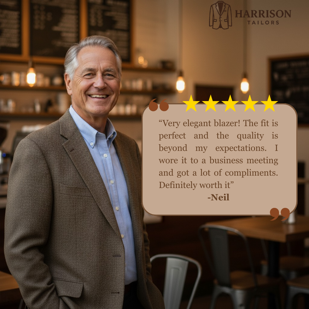 The blazer I ordered from Harrison Tailors fits like it was made just for me. The shoulders, length, and cut are absolutely perfect. I’ve never had a blazer feel this comfortable yet look so sharp!