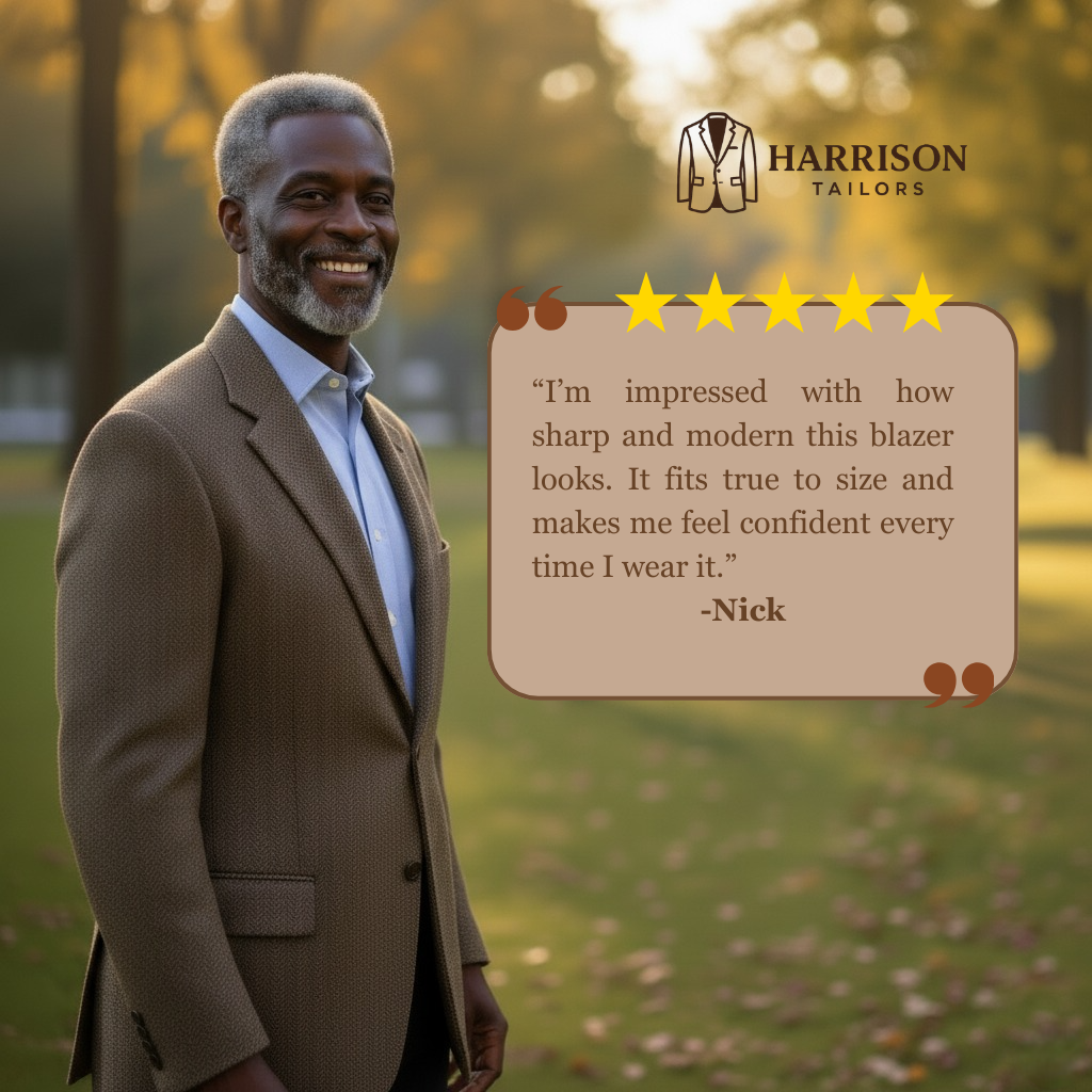 The blazer I ordered from Harrison Tailors fits like it was made just for me. The shoulders, length, and cut are absolutely perfect. I’ve never had a blazer feel this comfortable yet look so sharp!